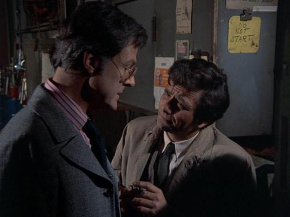 Anyway, now that the gutsy Lenore is dead, Brimmer loads her body in his car, removes her person and purse of all valuables, and dumps her corpse in a construction site. This guy is sure of himself. I mean, why not? He’s an ex-cop with lots of shady investigator knowledge under his belt. What he doesn’t count on was Lieutenant Columbo. The Lt. makes his appearance here while driving his dilapidated, blue Peugeot, which makes its debuts in this episode of the series as the Lt. is pulled over for a faulty headlight. The classic car was chosen by Peter Falk himself and fits Columbo to a tee.
