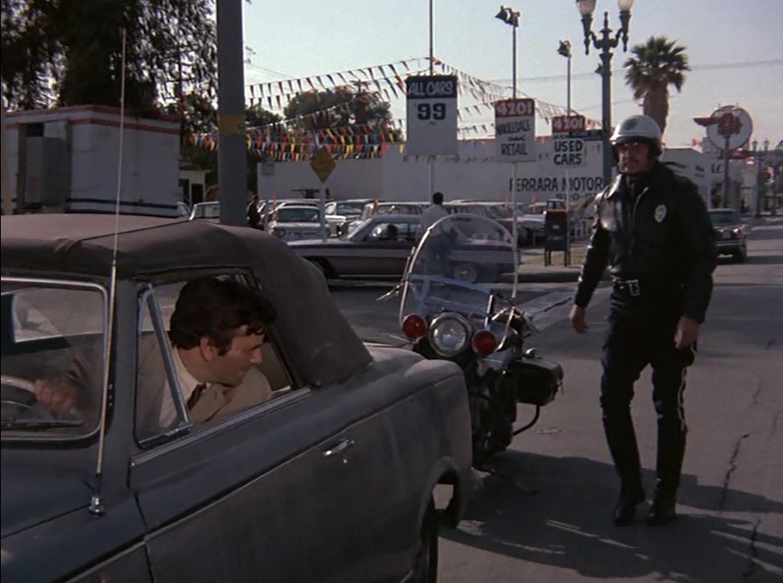 Columbo’s car is introduced in this episode when the Lt. is pulled over