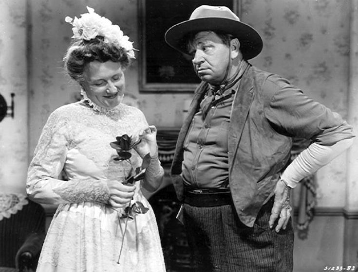 The Widow Hawkins-Chester Wooley situation turns out to be a blessing in disguise for Chester who eventually becomes Sheriff of Wagon Gap simply because every other man in town is afraid to be stuck taking care of the Widow. Let me tell you, the Widow is a doozy in Marjorie Main style. She is flirty, desperate for a husband, a raucous mother and an unapologetic farm lord. Widow Hawkins is such a character, in fact, that she alone keeps the peace at Wagon Gap, which was a notoriously lawless place prior to her falling into widowhood. Although there are many movie instances wherein Marjorie Main plays characters similar to Widow Hawkins, the resemblance is particularly noticeable in William Wyler’s Friendly Persuasion (1956) wherein she plays the riotous Widow Hudspeth with similar bravado, but with better results. The latter is a better film and resulted in a Golden Globe nomination for Ms. Main as Best Supporting Actress.