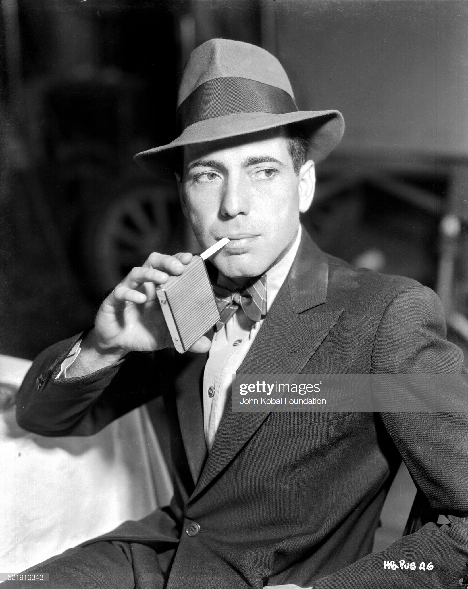 Posed portrait of actor Humphrey Bogart (1899-1957) wearing a hat and bow tie with a pack of cigarettes, for Warner Bros Studios, 1938. (Photo via John Kobal Foundation/Getty Images)