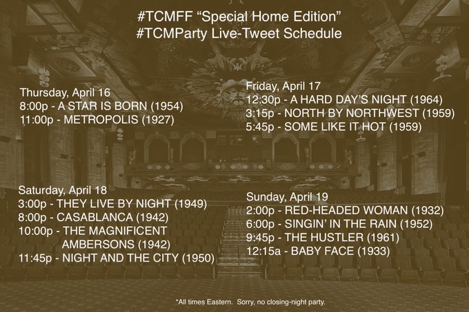 On Wednesday evening, fashion and film historian Kimberly Truhler will be presenting the Fashion in Film of TCMFF 2020 virtually. You can sign up for that webinar here. Kimberly’s presentations have become an essential part of TCMFF week every year. Finally, but certainly not least, be sure to follow @TCM_Party on Twitter by using #TCMParty. That group and hashtag are always active, but expect lightning fast activity during the TCMFF Home Edition. Here is the planned hosted #TCMParty schedule for some added fun, but join any time: