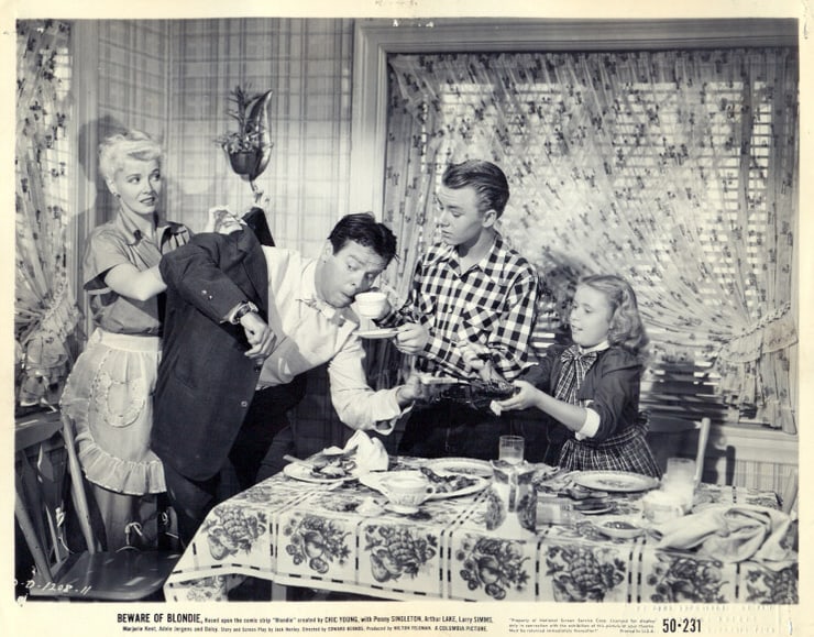 Some of the signature gags from the strip made it into the movies such as Dagwood running into the mailman every morning as he is late for work causing the mail to fly all over the place. That happened early in all of the movies welcoming devoted fans to the hijinks of their favorite family. Following Dagwood’s signature,” Blondieeeeee.” Dagwood’s legendary sandwich also made its way into every single one of the movies and into Webster’s New World Dictionary.