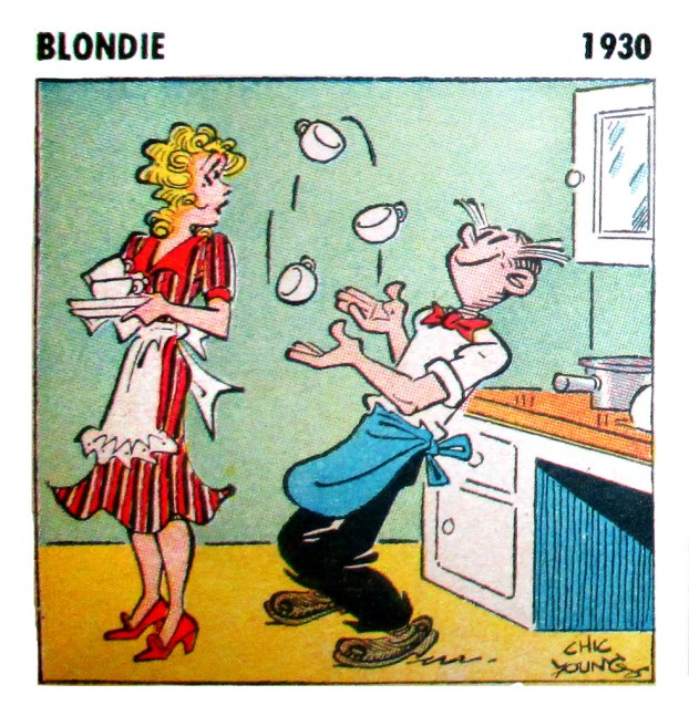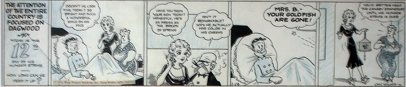 For the next couple of years, the Blondie comics centered on the couple’s struggles to get the Bumsteads to agree to the pairing. Blondie does everything imaginable to no avail. In the meantime, she also entertains several other admirers – although Dagwood was never far away. With readership dwindling, Chic Young and the comic’s distributer, King Features Syndicate, decided Blondie and Dagwood should finally get married and in February 1933 they did much to the chagrin of the Bumsteads who disowned their son and heir. Mr. and Mrs. Bumstead only grudgingly acknowledged the union because Dagwood went on a hunger strike that lasted over 28 days spotlighted by daily coverage and countdowns that helped circulation. Every day people tuned in to see how Dagwood was doing on the hunger strike. After all, one of his favorite pasttimes has always been eating. One of my favorite Blondie scenes is of Dagwood emerging from his bed after the hunger strike to reveal loads of dishes under the covers.