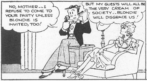 Blondie’s early days featured the star popular in dating circles. Her courtships made for several storylines. Blondie’s main squeeze, however, was bumbling playboy Dagwood Bumstead, son of millionaire industrialist, J. Bolling Bumstead. Dagwood introduced Blondie to his ill-natured father in the very first strip announcing their plans to marry. The elder Bumstead was aghast that his son would be interested in a woman of Blondie’s lowly social status.