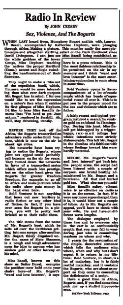 Many years ago I received a box set of old-time radio shows from a friend that included several episodes of Bold Venture, a radio action/adventure series Humphrey Bogart and Lauren Bacall starred in together from 1951 to 1952. I have spent a bit of time on the Bold Venture of late and thought it a fine way to honor Lauren Bacall for the upcoming anniversary of her birth. Not that a reason is needed to spend time with old-time radio programs.