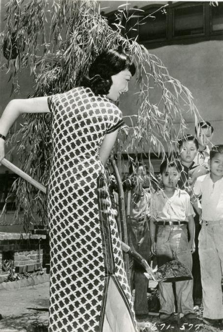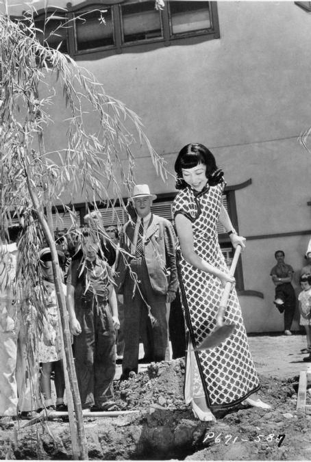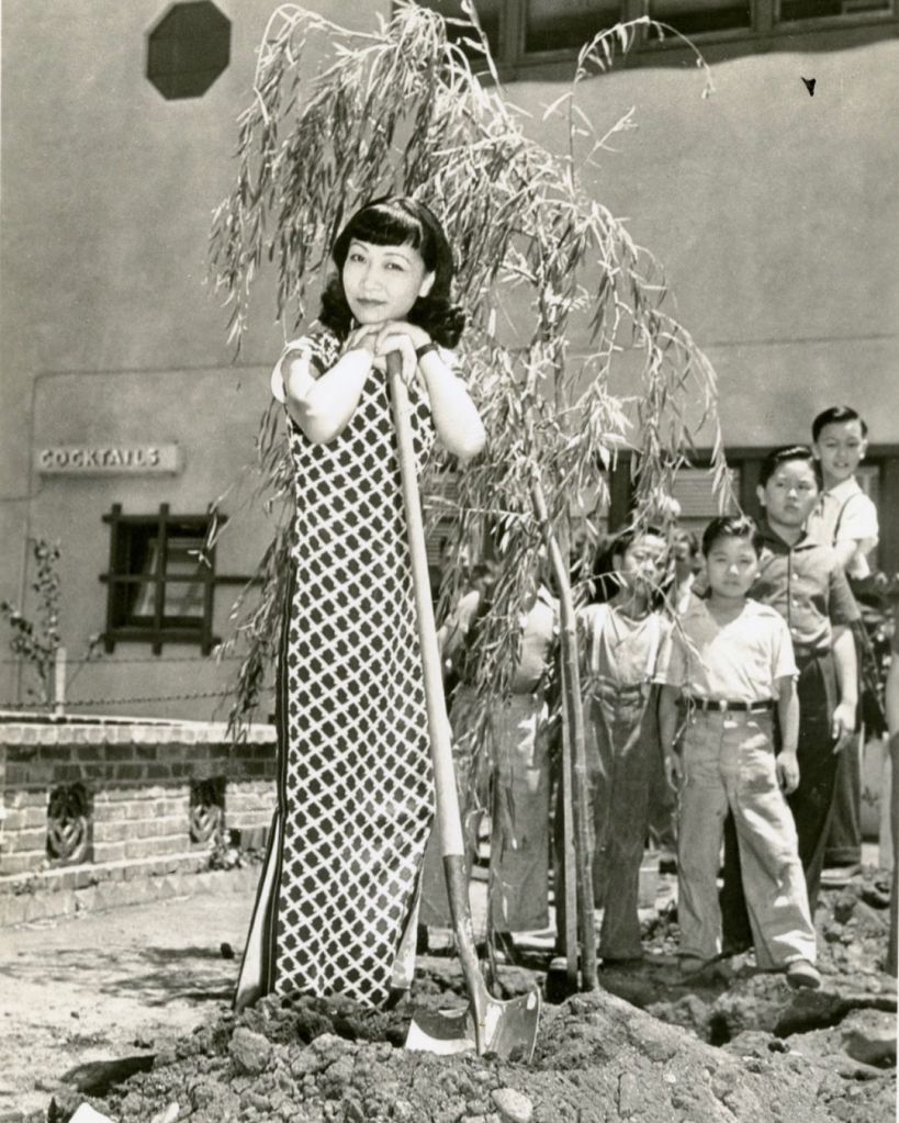 Anna May Wong, the first shovel in the grounds of Los Angeles Chinatwon’s Central Plaza, planting a ceremonial willow tree in 1938.