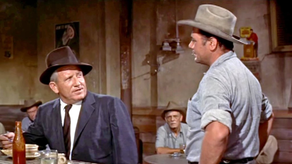 Trimble (Borgnine) harrassess Macreedy (Tracy) until the former in bested in a fight