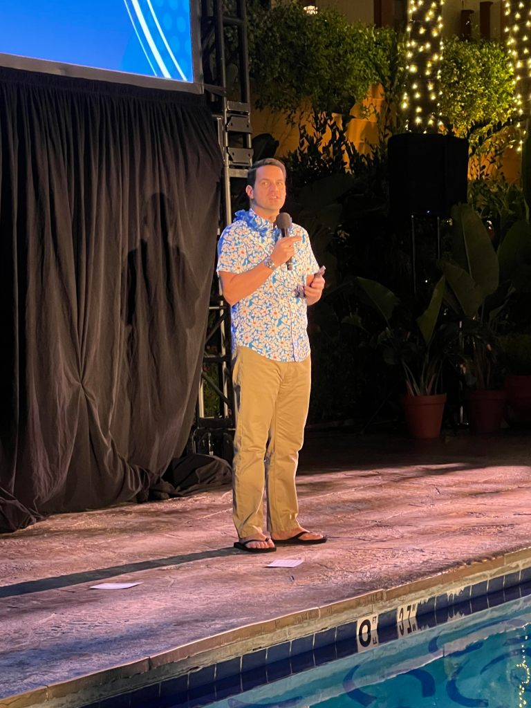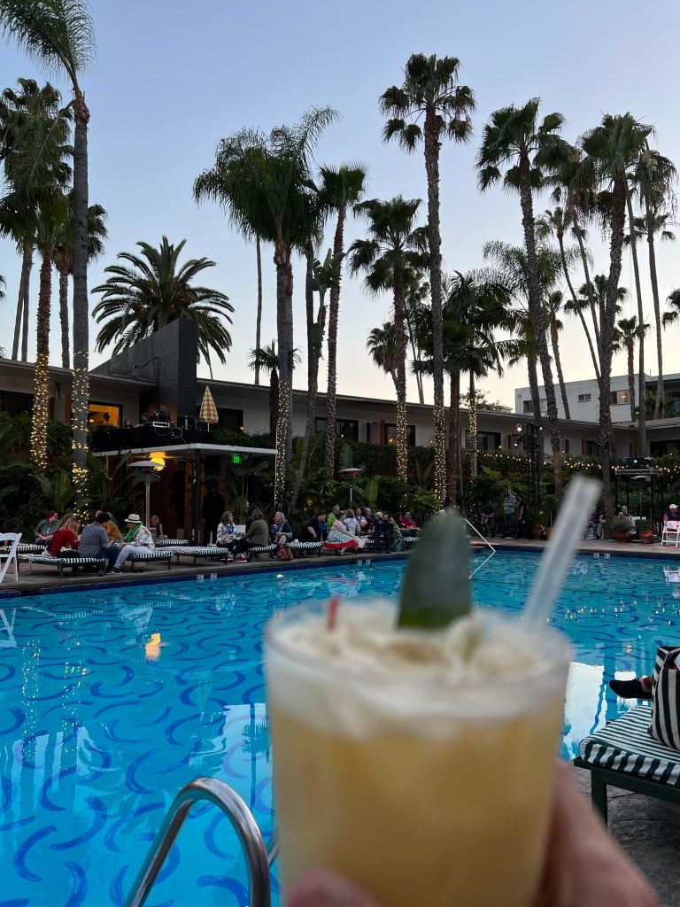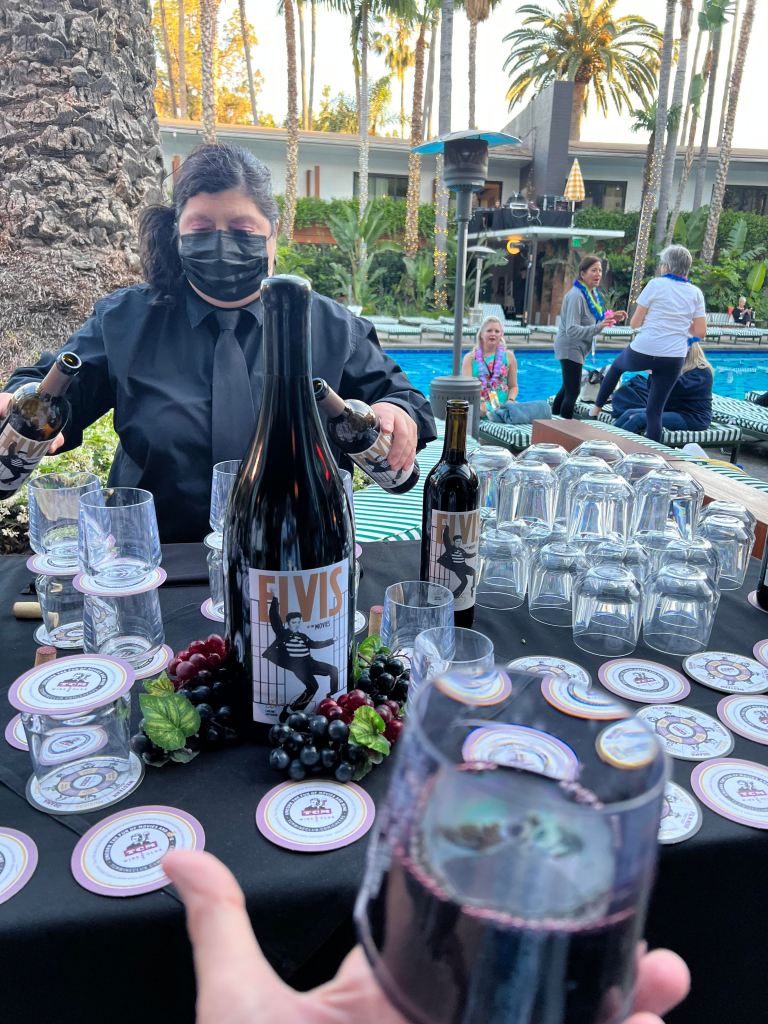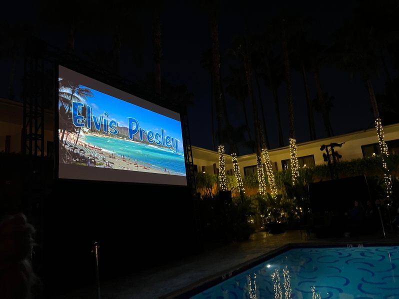 Following a memorable pre-code, I prepared for Elvis Presley and Norman Taurog’s Blue Hawaii poolside at the Hollywood Roosevelt. To say this screening also exceeded my expectations would be an understatement. I adore Elvis Presley as you may know, and poolside screenings are relaxing and beautiful as palm trees sway to your mood. TCM staff had leis ready to adorn us and the TCM Wine Club table had their best Elvis wine free of charge to get you going. Dave Karger introduced Blue Hawaii and the extremely happy crowd responded in kind with tropical drinks in hand. A fabulous time was had by all especially for the group of mostly TCMParty-ers who danced a mean Elvis throughout.