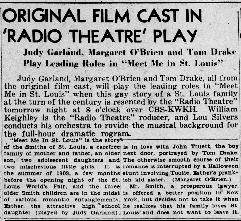 This is a repeat Lux Radio Theatre presentation of Meet Me in St. Louis originally from 1946 and it is a must: