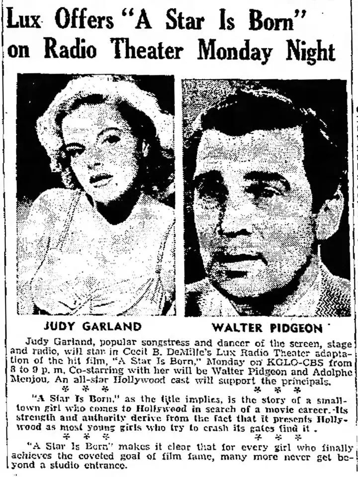 Judy returned to Lux Radio Theatre in December 1942 to perform in A Star is Born opposite Walter Pidgeon: