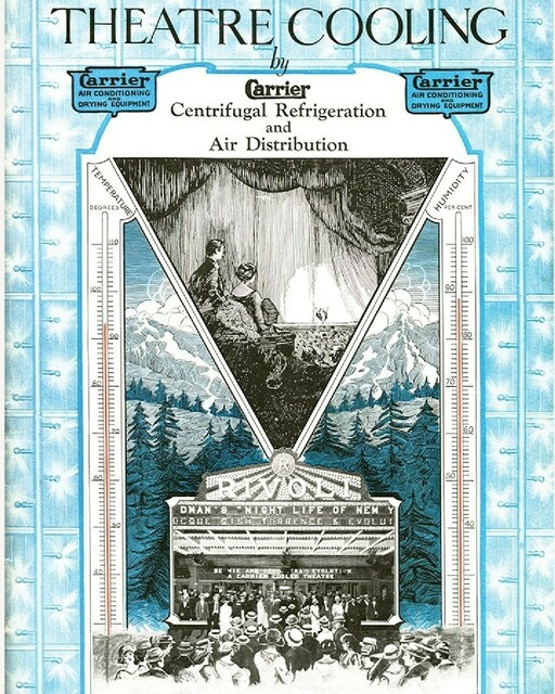 Over the next five years Carrier installed air conditioning systems in about three hundred theaters in the United States with more added every year thereafter. Eager to advertise theaters hung banners from their marquees that read “Cooled by Refrigeration” or “ice-conditioned” or any variation. The movie industry became the leader in promoting and practicing mass cool comfort.