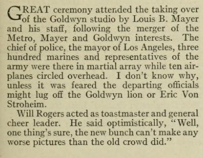 In April 1924, Loew’s theater circuit, which owned Metro Pictures, merged with Goldwyn Pictures and Louis B. Mayer Productions to form Metro-Goldwyn-Mayer. Under Louis B. Mayer’s management and Irving Thalberg’s tight reign on production (through 1936), MGM became the biggest and best studio as far as pre-production investment, its stable of stars (more than in the heavens), and its spectacle. MGM was run so successfully that it made money even through the Depression. One can get a clue as to what the merger of MGM meant in the film colony when Louis B. Mayer arrived at the former Goldwyn studios with his staff following the merger. From Photoplay….