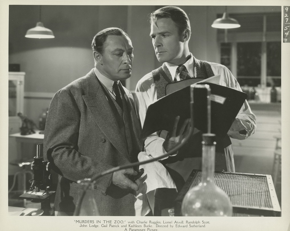 The Classic Movie Blog Association (CMBA) is hosting the Early Shadows & Pre-Code Horror blogathon this week and I could not resist the topic. So much so, in fact, that I chose two classics at random that I have never seen. This is the first. Directed by A. Edward Sutherland starring a stellar lot of players including Lionel Atwill, Charlie Ruggles, Gail Patrick, Randolph Scott, and Kathleen Burke, it’s Murders in the Zoo from 1933.