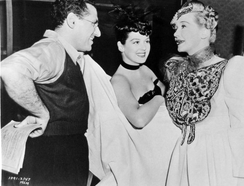 George Cukor, Rosalind Russell and Hedda Hopper on the set of The Women, 1939