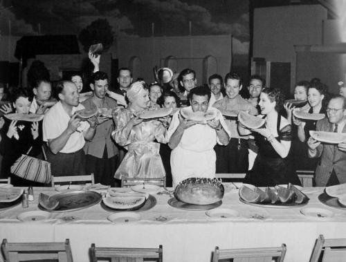 Joan Crawford, George Cukor & Norma Shearer in a watermelon eating contest.