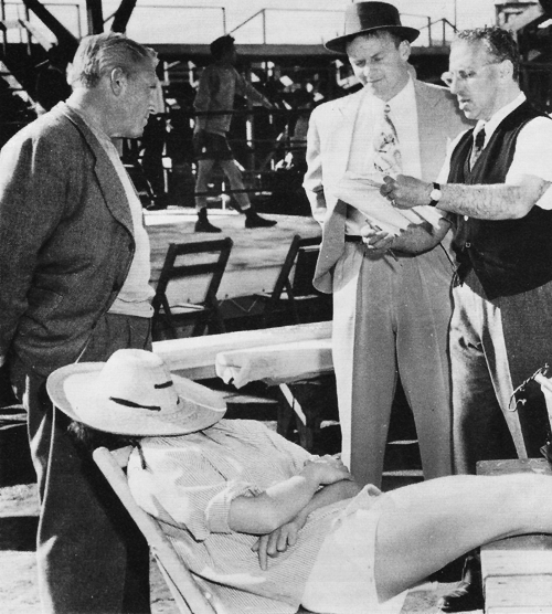 Kate Hepburn snoozes on set of Pat and Mike dir George Cukor goes over a scene with Spencer Tracy and Aldo Ray
